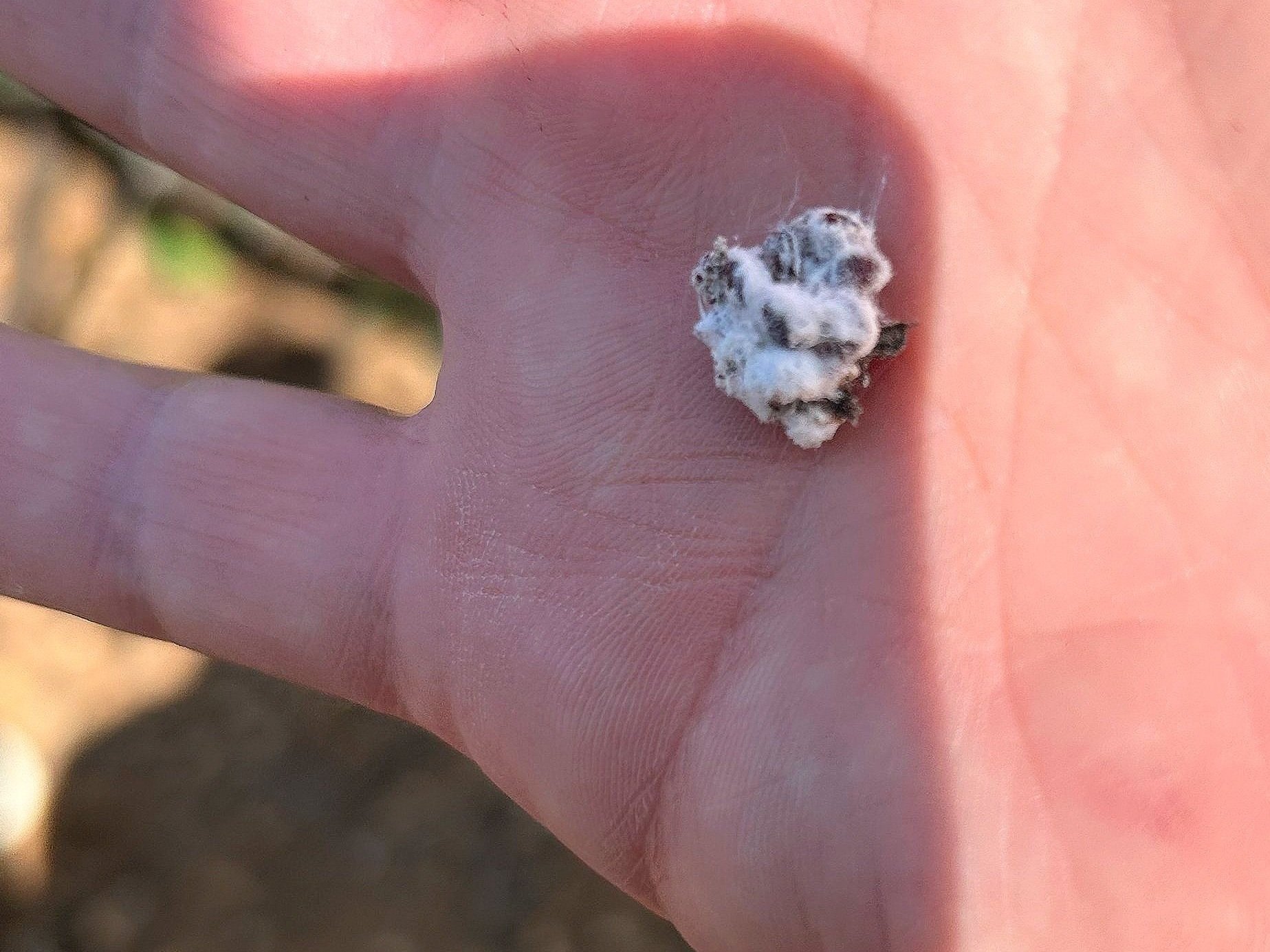 A smashed chochineal insect shows the white and black of the exterior of the insect and the red interior which is carminic acid and can be used to turn into a red dye. Photo by Keith Driver.