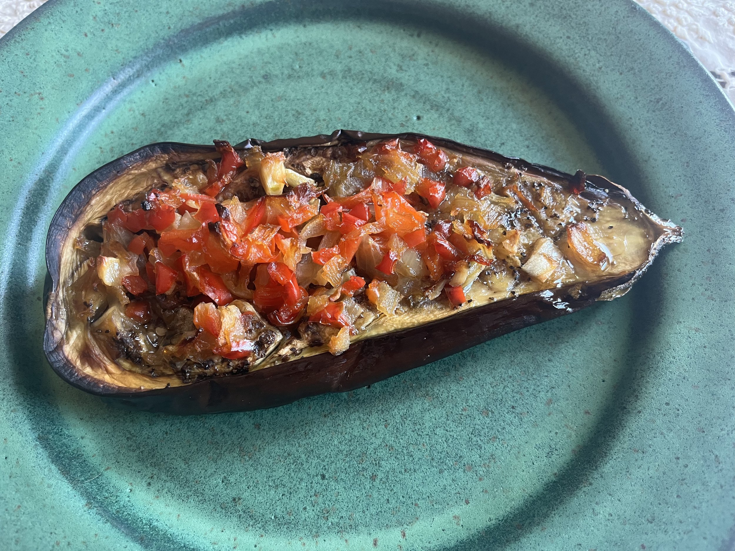 If you misjudge the timing and your eggplant is done too soon, turn off the oven or put it to low and cover the pan with aluminum foil. If you don’t cover it, the onion mixture will dry out. I forget to cover it sometimes and the dish will taste just as good – the texture will be different.