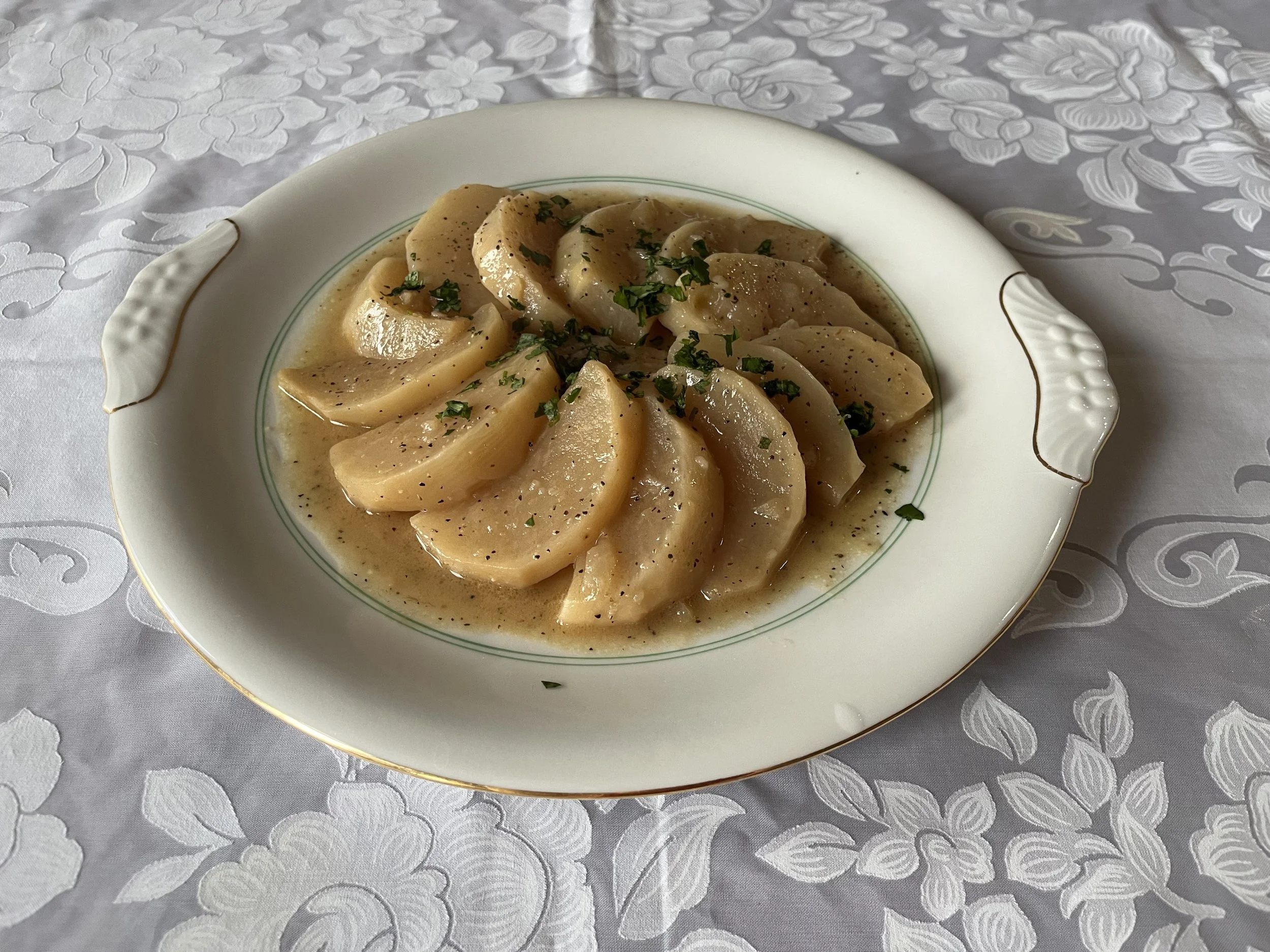 To serve family style, arrange the wedges in a circular pattern on a plate. Put the gravy on top. If you’re really going for the gentry style, make a parsley wreath on the exterior circumference of the turnips. Break off the thin parsley stems so you have small heads of intact leaves. Tuck the stems under the turnips so the leaves are outward. I didn’t think this through and had already chopped all of the parsley I had so I just sprinkled it on top.